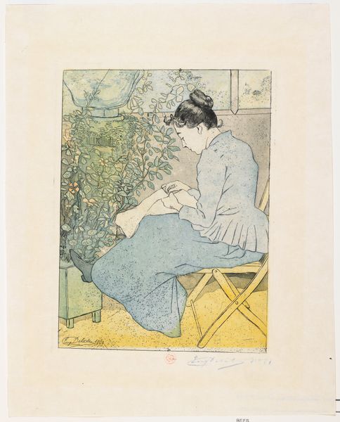 Editor: So, this is Mary Cassatt's "Woman Bathing" from around 1890 or 1891. It’s a print, primarily using pencil and some watercolor. There’s something so intimate about this scene. The woman seems completely absorbed in her ablutions, but what I find intriguing is its perspective within its socio-historical environment; what do you see in this piece from that standpoint? Curator: It's crucial to understand that Cassatt, as a woman artist in the late 19th century, had limited access to the same spaces and subjects as her male Impressionist counterparts. So, she frequently depicted women in domestic settings and everyday activities. This piece offers a glimpse into the private world of women, a realm often ignored or romanticized by male artists of the time. Editor: That makes sense. It feels like she's trying to capture a sense of the real, rather than some idealized version of womanhood. Is it perhaps also making some quiet claim of representation? Curator: Precisely. This portrayal is striking because of its stark ordinariness. The print challenges traditional representations of the female nude in art, where women were typically portrayed as objects of male desire. This is a moment of self-care, of private reflection, and not one meant for public consumption or admiration. She's washing! This also links her work, culturally, to an orientalizing aesthetic. Editor: Interesting. So, you’re saying that while Cassatt couldn't access some spaces and subjects, she could use these themes as points of departure for commentary on them. Curator: Exactly. The artist's perspective challenges societal expectations and constraints placed upon women in art. It forces the viewer to confront what is often unseen and unacknowledged in the artistic canon. By reclaiming control over her artistic subjects, Cassatt pushes for a new discourse in how we view the art world in relation to those left out of it. Editor: I see how much this reveals not just about her work, but the cultural dynamics around art creation in the late 19th century. Curator: And perhaps how some things have and have not changed. Thanks for pointing me to this artwork today.