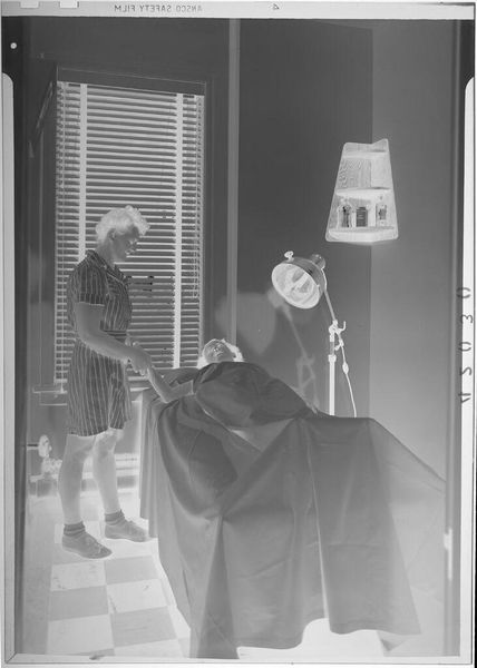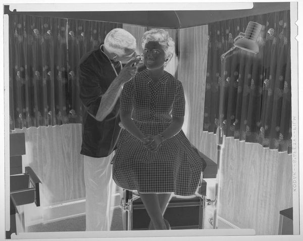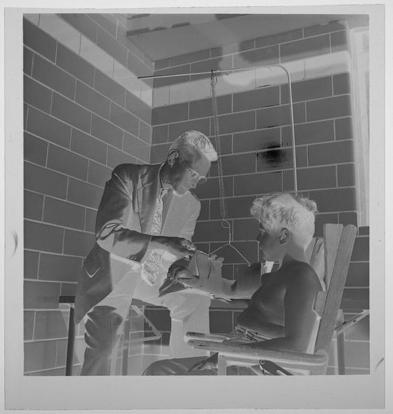 Editor: This is an untitled photograph by Jack Gould showing a doctor attending to a child with polio. It's quite small, only about two inches square. I find the stark contrast and the tiled walls very clinical. What symbols do you see at play here? Curator: The starkness amplifies the emotional weight. The child's arm brace becomes a symbol of both confinement and hope. The doctor, a figure of healing, evokes centuries of faith placed in medicine, recalling religious iconography of care. Editor: That's fascinating. I hadn't considered the religious connection. Curator: Consider how light and shadow emphasize the child's face, drawing us to his expression – a symbol of resilience itself. What might this photograph say about our collective memory of disease and recovery? Editor: It seems to capture a moment of vulnerability and the enduring human spirit to find comfort. Thank you for sharing your perspective. Curator: My pleasure. It is important to look back to understand the visual language of hope and healing, even in the smallest of images.