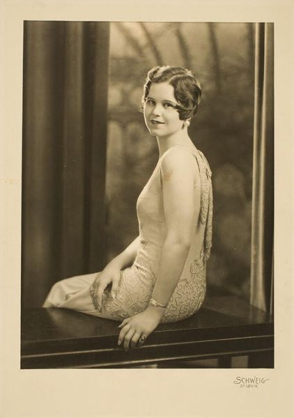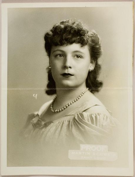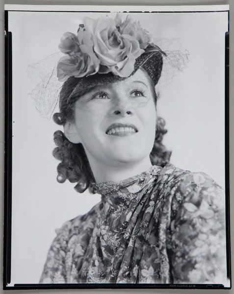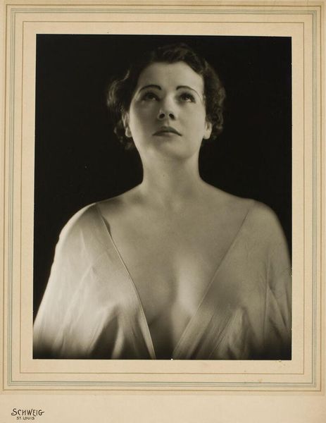 Curator: Before us is an intriguing photograph, an untitled work by Martin Schweig depicting a woman in a white fur collar, housed at the Harvard Art Museums. Editor: The tonal range is striking, immediately evoking a sense of classic Hollywood glamour tinged with melancholy. The fur collar dominates the composition, doesn't it? Curator: Absolutely. The high contrast between the dark garment and the brilliant white fur creates a powerful visual tension. Note how the light delicately models her face. Editor: The fur itself acts as a symbol of status and perhaps vulnerability. The soft texture contrasts with the implied coldness of the setting, a duality that complicates her image. Curator: Precisely. And Schweig's framing directs our gaze to the woman's gaze, which is slightly averted, as though lost in thought. Editor: It’s a compelling portrait that invites speculation about the sitter's story. The careful arrangement of tones makes this a powerful photograph that leaves us with lingering questions. Curator: Indeed. It's the visual rhetoric that I find most appealing.
