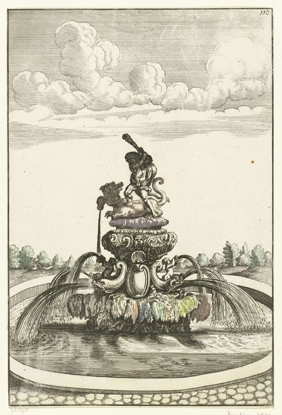 This image shows an anonymous depiction of a 'Square basin with semicircular bulges', made using an engraving technique. The fountain is precisely structured, emphasizing geometric clarity through linear design. The composition divides the scene into distinct horizontal layers: the checkered ground, the detailed basin area, and the sky above. Each level contributes to a sense of structured depth. The use of line is particularly striking. Notice how the lines delineate the architectural features, and the cascading water, creating a sense of movement and dynamism. The artist employs color sparingly, accentuating certain features like the statue and floral arrangements, drawing the eye and adding visual interest. The statue centered within the fountain serves as a focal point, drawing our attention to a blend of natural and constructed elements. Through a semiotic lens, the fountain represents more than just a water feature; it symbolizes control over nature, reflecting themes of order, beauty, and the artificiality of constructed landscapes. The absence of a defined viewpoint destabilizes established conventions, creating a timeless quality.