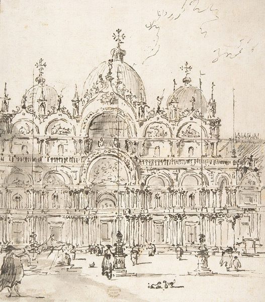 Curator: What a stunning photograph. This is "Cathedral of San Marco," published by Ferdinando Ongania. It captures the Basilica's facade in incredible detail. Editor: It feels monumental, yet strangely subdued. The sepia tone lends an air of antiquity, but there's also something almost… vacant about the plaza. Curator: It certainly presents a constructed vision of Venice. Ongania was a key figure in Venice’s art scene, shaping its image through publications like this one. Notice how the figures are carefully placed to enhance the building's scale and grandeur. Editor: The domes are so evocative, aren't they? Symbols of Byzantine power, each curve whispering stories of faith, authority, and Venetian ambition. It almost feels like a stage set, inviting us into a history play. Curator: Exactly. Ongania used photography to propagate a certain image of Venice, and this image of San Marco speaks volumes about the city's self-representation in the late 19th century. Editor: It’s a potent reminder that even a photograph, seemingly objective, is loaded with cultural and historical meaning. Curator: Indeed. It leaves me considering the power of imagery and how it influences our understanding of Venice. Editor: And for me, it prompts reflection on the layered meanings held within architectural forms, constantly shifting across centuries.