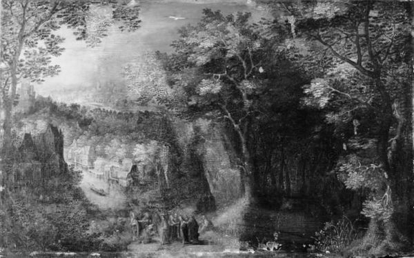 Editor: So, this is Abraham Govaerts' "John the Baptist in the Wilderness. St. John Preaching and the Baptism of Christ," made sometime between 1604 and 1626. It’s an oil painting on wood. What strikes me immediately is the dramatic contrast between light and shadow. What symbols or imagery do you find most compelling here? Curator: Well, consider how wilderness is depicted across cultures. It's a place of testing, of spiritual purging and renewal. John the Baptist, positioned within this dense landscape, embodies that liminal space. The very trees seem to whisper ancient knowledge, their forms echoing the figures engaged in baptism further into the depths of the painting. Editor: That's fascinating! The positioning definitely seems intentional. So, what does the Baptism itself signify in the broader context? Curator: Water, of course, is primordial, representing cleansing and rebirth. Look how light seems to emanate from that event, suggesting a kind of spiritual illumination radiating outward, not just touching the immediate participants, but seeping into the surrounding world. Even the animals present contribute, each symbolizing a specific aspect of this renewal: innocence, sacrifice, attentiveness. It’s a whole visual theology condensed within the landscape. What about you; what's your personal impression of its meaning? Editor: I suppose I focused so much on the visuals; it is really compelling what you're saying. Curator: And that's valid. Don't underestimate the personal encounter with the image, it has the capacity to alter memory itself! Editor: I appreciate that insight; seeing how symbols can function like a cultural memory device is incredibly valuable. Thanks!
