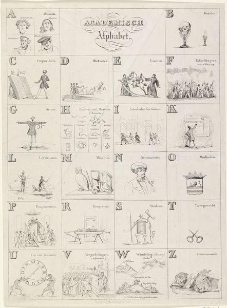 Curator: Here we have "Vervolg van het nieuw prentkundig ABC voor lieve kinderen, met toepasselyke versjes" which roughly translates to “Continuation of the new illustrated ABC for good children, with applicable verses,” made sometime between 1856 and 1900. The printmaker goes by the name of Monogrammist JZ. This print reminds me of an alphabet sampler, each square trying to illustrate the featured letter. What are your first thoughts about the visual structure of this work? Editor: I notice that each letter has a corresponding illustration and poem beneath it. It seems like a tool for teaching children the alphabet, though some of the imagery seems quite antiquated. What do you see when you examine the piece through a formal lens? Curator: Immediately, I’m drawn to the organization. The grid format dictates the composition; each square, a self-contained unit, relates to the whole. Notice how the engraver uses line weight and density to create visual interest within each block. It's primarily decorative-art, rather than fine art. What is your reaction to that? Editor: Yes, now that you point it out, I see how each little scene almost repeats the same structure. Is the variety of figures, the ox, the man with a shovel, etc., still relevant to a formalist reading? Curator: Precisely. While the subjects vary, the artist's treatment remains consistent. The figures are simplified, almost stylized, existing primarily to define the letter and illustrate the verse. It’s less about representation and more about design, line and form taking precedence. And what are your thoughts about how the formal design choices affected the work as a whole? Editor: It’s amazing how the structure highlights both the utility and artistic value. I hadn’t quite grasped that on my own initially, but this perspective truly elevated the whole viewing experience for me.