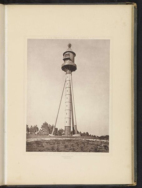 Curator: Before us, we have a photograph titled "Vuurtoren van Richard", dating from before 1883. It’s a striking landscape utilizing a printmaking process. Editor: It feels so...stark. The stark contrast of the pale tower against the slightly cloudy sky really drives home its verticality, this kind of reaching gesture. Almost unnerving in its precision. Curator: I’d agree. The image's structure uses a simple triangulation motif – the converging lines of the tower's support structure contrast beautifully with the gentle curve of the hill it stands upon. And that repetitive columnar design ascending towards the light source at its peak--masterful! Editor: Definitely. Light has been the crucial signal here; a guiding star. But it is still rooted on the earth. Do you see it also as something to do with finding our way back to the shore when hope fades or disaster happens? Curator: Perhaps! That is where the composition truly succeeds, isn't it? The photographer used light not merely as illumination, but also for tonal contrasts defining its cylindrical shape. This formal clarity provides stability. Editor: It absolutely speaks to a universal desire, especially in the era it was made, when travels were so common, and technology, particularly travel-related technology, such as steamships or, in our case, lighthouses, carried deep meanings of a bright future and an ultimate arrival to safe shores. It is just light in the physical structure but implies guidance and protection. Curator: And I would posit it is because the artist chose realism in technique – avoiding overt idealization or romance – which strengthens the viewer's engagement with this central beacon. Editor: Perhaps we should not separate function from aspiration; the lighthouse transcends its functional essence to become something greater. The "Vuurtoren van Richard" provides a steady gaze amid changing seas of life. Curator: Indeed. When dissecting each line and subtle tonal shade, what this photograph ultimately represents, is about resilience – not merely structural, but also psychological. Thank you for providing that viewpoint!