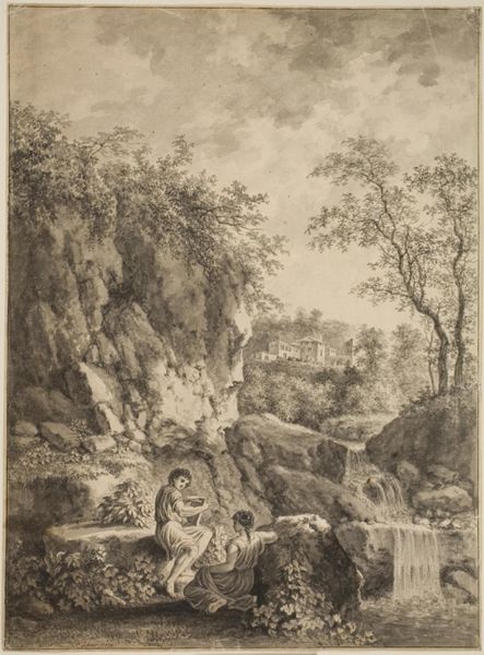 Curator: Here we see Jean Ouvrier's "View of the Apennines," a work of unspecified date housed at the Harvard Art Museums. Editor: Immediately, I'm struck by its dynamic composition—the deliberate contrast between the chaotic foreground and the structured background. It creates a sense of visual tension. Curator: Indeed. Ouvrier masterfully employs line and tone to build depth and spatial relationships. Consider the bridge, acting as a compositional link, drawing our eye into the distance. Editor: And the figures in the foreground seem to embody the cultural memory of this place. They evoke a classical pastoral scene, an almost romanticized relationship with nature. Curator: Perhaps. Though, from a purely formal standpoint, their arrangement enhances the sense of scale, emphasizing the vastness of the landscape. Editor: I think this work captures something about the way we have always understood and constructed the landscape in the popular imagination. Curator: Perhaps. The interplay of forms certainly invites that speculation. Editor: It’s a thoughtful landscape; its symbols still resonant with meaning.