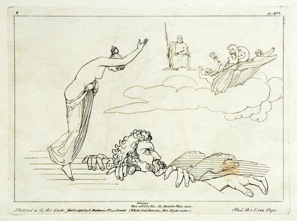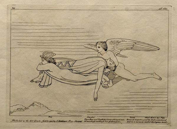 Curator: Here we have John Flaxman’s "Illustration to the Iliad," an engraving from 1795, steeped in Neoclassical ideals. It’s executed with a confident, spare line. What strikes you first? Editor: Well, immediately, the wind! I mean, figures literally blowing, propelling... something… forward. There’s such force conveyed despite the almost skeletal simplicity of the line work. It feels, paradoxically, both airy and incredibly determined. Curator: That linearity is so key to understanding Flaxman. He was profoundly influenced by ancient Greek vase painting, distilling form to its purest essence. Look at how he suggests volume and movement with such economy. The blowing figures, clearly deities… Editor: The winged helmets give them away, don’t they? Hermes, perhaps? Are they harbingers of doom or deliverance for the slumped figures beneath? There's an ambiguity there that really hangs in the air. It makes me wonder, what were the dominant interpretations of the Iliad at the end of the 18th century? Curator: Interesting. The Iliad, of course, is a foundational epic, dealing with themes of war, fate, and human fallibility. Flaxman's visual interpretation reduces the sprawling narrative to these core allegorical components. Each element is purposefully rendered: the horizontal lines of sleep, contrasting against the forceful, almost aggressive blowing of the wind. It makes you feel as if destiny is forced upon mortals in the realm of dreams. Editor: Right, like being nudged, not so gently, out of a dream state and propelled into waking life by… fate itself! I notice that those being "blown" upon appear mostly androgynous and, dare I say, like they have little free will. Curator: Flaxman really does present humanity as vulnerable against cosmic forces, something very appropriate to the themes running through the story of the Iliad itself. It speaks to the grand sweep of history that still connects to modern experience and fears. Editor: It certainly invites reflection. One is swept away by inevitable circumstance and must somehow brace themself against its fierce winds. Thanks to Flaxman's visualization, that sentiment echoes with a peculiar kind of beauty.