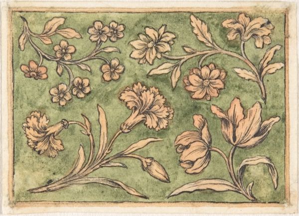 This vibrant textile design in the East Indian style was rendered anonymously using opaque watercolor and ink on paper. The floral and paisley patterns speak to a complex history of cultural exchange and colonial influence. Consider the East India Company, a powerful British institution that dominated trade between India and Europe. It's possible that this design was made for the European market, catering to a taste for exotic orientalism, or perhaps as a study for the company's designers. The visual codes present—the lush, stylized flowers and the curving paisley motifs—draw on established traditions of Indian textile design. The design may reflect the impact of British aesthetic preferences on Indian artistry. Understanding the social conditions surrounding this artwork involves archival research into trade patterns, company records, and the biographies of artists and merchants involved in the exchange of goods. The meaning of this design lies not only in its aesthetic qualities but in its entanglement with colonial power structures.