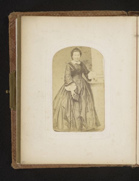 Curator: Welcome. Here we have a photographic portrait, "Portret van een vrouw, staand bij een stoel," or "Portrait of a Woman, Standing by a Chair," made with the gelatin silver process, sometime between 1860 and 1900. The photographer is Theodor Huth. Editor: What strikes me first is how incredibly contained she appears. She's framed within a frame, within the album, within the image. There's a formality, a certain stillness, and a… wistfulness? I can’t help but wonder what she’s thinking. Curator: Indeed. Studio portraits like these were carefully constructed performances. Her posture, her dress, even the placement of the chair were all carefully considered to convey status, respectability, and certain ideals of womanhood at the time. It's a staged reality designed for public viewing and posterity. Editor: Yet, within that constructed reality, you see glimpses of the individual. There’s a subtle energy to her face, like a tightly wound spring. I mean, look at how her hand rests so lightly on that chair! There’s something both elegant and defiant in that. Curator: That’s astute. The rise of photography democratized portraiture, but it also became a powerful tool for social control, dictating standards of beauty and behavior. Photography studios were commercial enterprises, shaping public image in ways both obvious and subtle. Editor: It’s like she’s caught between two worlds—the rigid expectations and her own inner life. It’s also really fascinating how that neutral background almost forces you to focus on her and that beautiful costume! I wish more of these photographs would let you in! What did she want to say? Curator: And therein lies the enduring power of the portrait. It provides a record, however mediated, of an individual's presence in time, inviting us to consider the social context in which they lived, but also to engage with the enigma of the human spirit. Editor: Looking at this image makes me question whether this photograph is hiding just as much as it shows... or, maybe more? These sorts of artworks invite introspection: about history, about societal structure and about what is not represented!