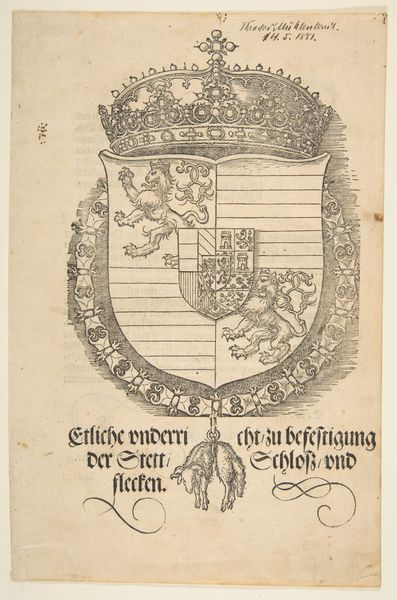 Editor: Here we have a print from 1502, attributed to the Dürer school. It’s titled "Coat of Arms of Maximilian I as King of the Romans," with its verso displaying "Coat of Arms of Florian Waldauf von Waldenstein," taken from "The Revelations of Saint Bridget." Seeing this complex web of heraldry in stark ink gives it such an air of formal power, yet feels strangely playful at the same time! What exactly are we looking at? Curator: Ah, you’ve hit on something marvelous already. I see this image as an intricate dance between the earthly and the aspirational. A woodcut bustling with the iconography of empire – eagles, lions, shields—each precisely rendered to communicate power. Now, consider that for a moment—power made reproducible. In the early 16th century, printmaking was utterly revolutionary. These armorial bearings? It's like a family tree rendered in steel. They shout lineage. Look at how the design teeters between medieval tradition and that burgeoning Renaissance swagger, no? Tell me, what do you imagine about those early audiences experiencing something like this? Editor: I hadn’t considered the mass production angle – that really reframes the power dynamic! But it is curious how this intricate level of detail must have meant something specific back then... symbols everyone would have understood, now largely lost. Does it matter we don't "get" every single detail? Curator: Does it matter? In some ways, no. Our own ignorance offers something unique; a space for our projections and interpretations! It gives this art a fresh pulse. But yes, understanding that medieval/Northern Renaissance context undeniably enriches. Look closely; are those playful grapes perhaps commenting on earthly indulgences, alongside such declarations of holy authority? Editor: That's so interesting; seeing them not just as symbols of power, but perhaps offering wry commentary on it. I hadn't even noticed the grapes before, too busy being overwhelmed. Thanks! Curator: Absolutely! See what unfolds when we permit ourselves to play a little!