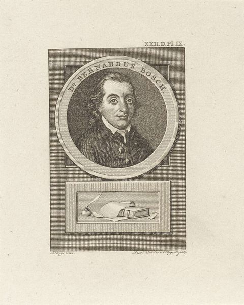 Curator: This engraving, "Portret van Thomas Hoog" from 1804, currently residing in the Rijksmuseum, presents its subject in such a formal and perhaps rigid manner. The lines are clean, the details precise. It feels very…controlled. What strikes you initially about this piece? Editor: Yes, that formality definitely comes across. For me, it's the almost photographic level of detail achieved with engraving. It feels so…modern, in a way, even though it's centuries old. I'm curious, though – what do you see in this work beyond the initial impression of formal portraiture? Curator: Well, darling, for me, portraits always whisper secrets. Think about it – who commissioned this? Who *was* Thomas Hoog? Look closer at the man himself. Is he inviting or aloof? Notice the engraved text beneath. “Preacher in Rotterdam” it states, alongside flowery, almost reverent language. Suddenly, the portrait gains depth. We are offered a glimpse into the status of the person portrayed, but what's omitted intrigues me. Does the rigidity speak to social constraints of the era, the sitter’s personal character, or perhaps the engraver's own style? Editor: That makes me see it differently. The text does add a whole layer of context – suddenly he’s not just a man in a frame, but a figure of importance. But if the sitter wished to communicate a concept, maybe something of virtue? Curator: Precisely. Or perhaps that was how *society* wished to portray its respected members. Aren’t we all playing a role? And what’s so thrilling about art if not deconstructing such personas. Editor: This has really opened my eyes to the hidden stories within portraits. It is more than just depicting someone’s likeness! Curator: Exactly. A captured fragment, pregnant with implications that cascade outwards… delicious, no?