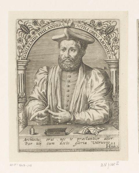 Editor: Here we have Robert Boissard’s "Portret van Johannes Aventinus" created between 1597 and 1599. It's an engraving, so the lines are very precise and create this intense sense of detail. What's striking to me is how the printmaking process itself becomes so evident; you can almost feel the pressure of the tool on the plate. What catches your eye about it? Curator: It's compelling to consider the printmaking process not merely as reproduction but as a labor-intensive act itself. Look closely at the hatching and cross-hatching – these aren’t just lines describing form, but physical marks made by an artisan. The value wasn't on some artistic, innate skill, but rather about the skill to use a material to circulate knowledge at that time. Think of how that intersects with Aventinus himself, a historian. What do you suppose this accessibility meant to the rising merchant classes? Editor: I hadn't really considered it in that light! It democratizes knowledge, doesn’t it? Moving away from unique, commissioned artworks to something reproducible, putting information directly in the hands of, say, traders, and challenging the existing aristocratic monopoly. Curator: Exactly! And even the presence of the book he's holding is not merely symbolic but an index of a growing book trade, and the rising importance of access and literacy amongst social classes. Consider also, the type of ink available at the time, the kind of paper…the very materiality of this print speaks volumes about the culture that created it and was in turn shaped by it. Editor: So, it’s about looking at these materials and techniques as not just *how* it was made, but *why*, and what that means about 16th century society. That makes you see the image very differently. Curator: Precisely!