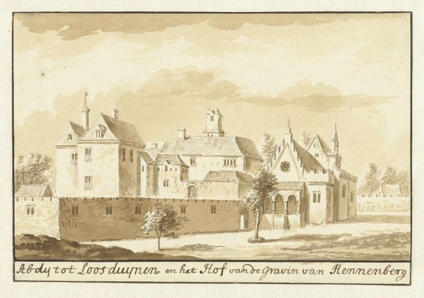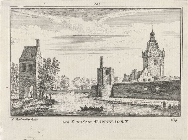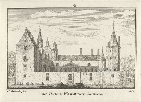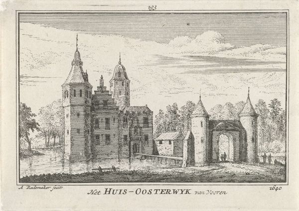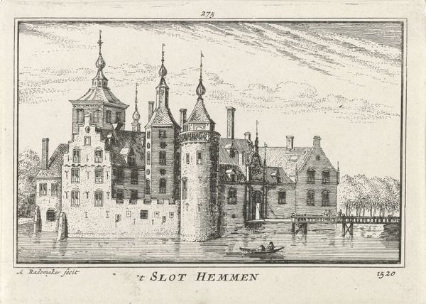 Curator: My initial reaction is this engraving projects an aura of serene authority, doesn't it? The building practically emerges from the water. Editor: I can see that! It also speaks of something inaccessible, something held back. Almost as though it’s protecting itself from some sort of unseen threat. Curator: Indeed, Abraham Rademaker’s "Gezicht op Huis ter Does bij Leiderdorp, 1620", crafted between 1727 and 1733, shows us much about the period's relationship between architecture and societal symbolism. As you can observe, Rademaker employed detailed engravings in the Dutch Golden Age style to depict this impressive structure and landscape. Editor: What particularly gets me are these meticulous lines forming the water – repetitive, almost hypnotic. But why focus so acutely on this building? What's the significance of "Huis ter Does?” Curator: These kinds of country houses functioned as powerful symbols of status and wealth, during the Dutch Golden Age. This building was made during this era. Its reflection mirrors both the grandeur of the architecture but also suggests, perhaps, its inherent fragility or impermanence. Water, often, is interpreted as the element that symbolizes flux, transformation, or even destruction. Editor: Oh! Water can wash it all away… Speaking of things unseen: What stories might these walls conceal? Who resided there, and what dramas unfolded? Rademaker is pointing us to history… Curator: Undoubtedly. Prints, like these engravings, play a vital role in how places remember history and how those images themselves shaped the cultural identity during that epoch. In psychological terms, it could be argued the imposing presence symbolizes deeply embedded societal constructs of class and authority that permeated this landscape. Editor: Fascinating. I was initially drawn to the artistry and how the engraver chose to depict the structure, but now I view the deeper interplay of symbolism. It invites us to delve deeper than the eye lets us, uncovering not just visual but layered meanings steeped with Dutch history. Curator: And for me, examining “Gezicht op Huis ter Does” highlights the function of artistic symbolism as well as our ability to discover deeper narratives through understanding them.