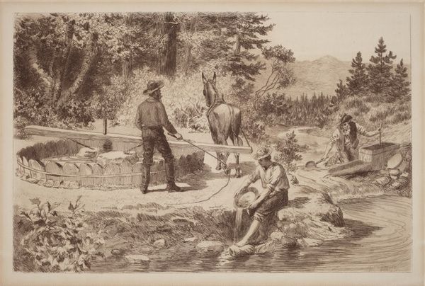 This is the left panel of "Pastoral Life of Saint Geneviève" by Georges-William Thornley, a print on paper. The image presents an idealized vision of community life, evoking classical and religious themes. We see a group of muscular figures, some nude, engaged in various activities around a body of water. Some figures are kneeling or carrying a body, suggesting themes of piety and care. Made in France during a period of artistic experimentation and social change, the print reflects a fascination with both classical ideals and religious sentiment. The emphasis on pastoral life and community resonates with broader social movements, such as Christian socialism, seeking to revitalize traditional values within modern society. The work also participates in the academic tradition of history painting, and the institutions of art that promote such images. To fully understand Thornley's work, we might consider how this image relates to the artistic debates of its time. The historical context, including religious, social, and artistic movements, enriches our appreciation of this piece.