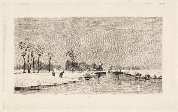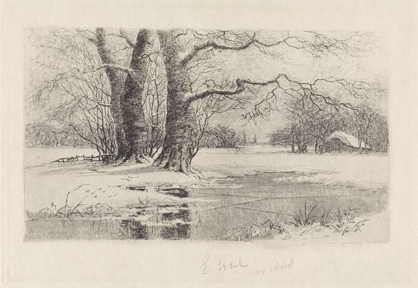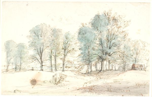 Curator: Welcome. Before us hangs P.C. Skovgaard's "Aaen gennem Breelde skov ved Usserød," created in 1847 using ink and pencil. Editor: Immediately, there's a palpable sense of calm; the monochromatic palette evokes a quiet, contemplative mood. Curator: Indeed. Skovgaard, deeply embedded in the Danish Golden Age, used landscape to foster national identity and cultural values. This particular scene is a romantic interpretation, subtly reflecting the socio-political emphasis on nature as a sanctuary. Editor: What strikes me is the delicate linework. Notice how Skovgaard captures the bare trees' intricate branches against the soft sky and how that careful balance between detailed texture and openness gives form to a silent symphony. Curator: And don’t overlook the strategic placement. Consider the politics of this idyllic setting against the backdrop of increasing urbanization. It reinforced agrarian values at a pivotal moment. Editor: That dark and light ink application produces depth and spatial complexity within such minimalist design choices, highlighting texture and natural form to bring this serene vista to life. Curator: Moreover, this specific locale - near Usserød - resonated with notions of regional heritage and national pride. Editor: I do agree; yet focusing solely on symbolism feels reductive given such subtle gradations that allow form and mood to carry equal meaning; his technical skills demonstrate acute observation and remarkable visual expression! Curator: However, this scene served a particular socio-cultural function by representing quintessential Danish scenery. In a Denmark grappling with cultural independence, promoting shared natural resources contributed powerfully to civic sentiment. Editor: I now concede: understanding what this imagery signifies through context and what it conveys just through how the visual information stimulates understanding opens an even broader range than merely its semiotic framework! Curator: Precisely! Examining how this drawing engaged the Danish public helps understand how images cultivate social imaginaries and national belonging. Editor: Looking once more gives a comprehensive image which encapsulates historical understanding plus inherent qualities—illuminating deeper perspectives both visual and societal values were formed during this epoch in Skovgaard’s drawing: insightful thoughts that create dialogues.