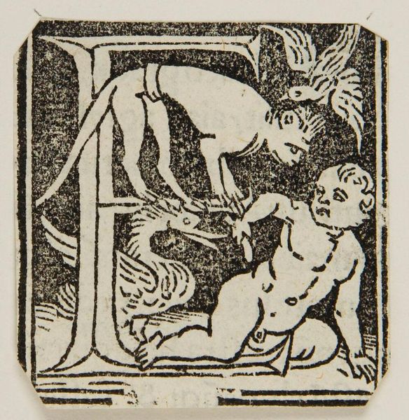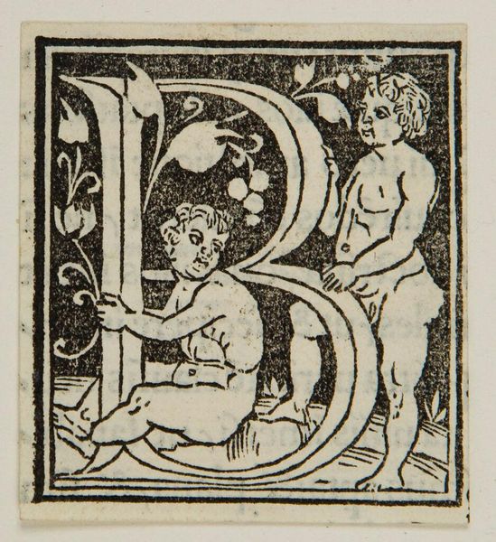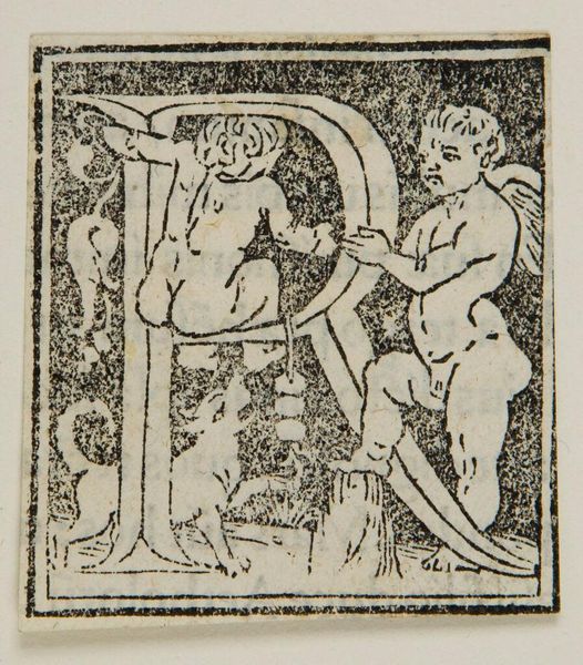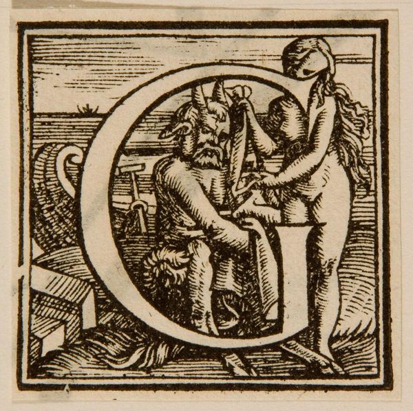 Curator: Here we have an intriguing woodcut, simply titled "Initial C", created by an anonymous artist. It’s part of the Harvard Art Museums collection. Editor: It has such a stark visual impact, doesn't it? The high contrast of black and white really makes the figures pop within that bold letterform. Curator: Indeed. Initial letters like these were commonly used to mark the beginning of chapters or significant passages in books, adding visual flair and signaling importance. Editor: The composition is interesting, the figures almost seem staged, arranged carefully within the curve of the "C", with a strange little dog beside them. Curator: Consider the role of images in conveying status and learning. The inclusion of children, for example, could reflect societal values regarding education and the family. Editor: You're right, the figures do give a sense of innocence or perhaps a didactic purpose. The formal qualities really amplify this feeling. Curator: Absolutely, each detail tells a story about the book’s patron, printer and intended audience, reflecting the book arts of the time. Editor: It’s amazing to see how much information can be gathered from such an anonymous work. Curator: Agreed, a testament to the enduring power of art.
