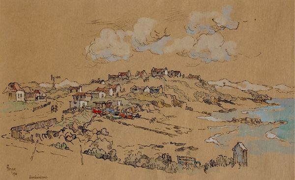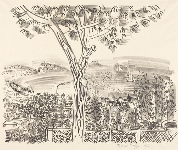 Curator: Well, this watercolor by Raoul Dufy, titled "Vallauris," painted between 1927 and 1928, hits me with such breezy, lighthearted energy. I mean, look at the way he’s captured that Provençal light! Editor: My first thought looking at this landscape, "Vallauris," is its clear demonstration of a post-WWI European recuperation fantasy. Note the utopian longing for pastoral simplicity and the depoliticized celebration of the rural sphere as the natural locus of cultural life. Curator: Recuperation, that's one way to put it! For me, it's just such a joyful scene. The way he layers the watercolor, it almost dances. The orange roofs of the buildings nestled into the rolling hills... it feels like pure pleasure on paper. Editor: Perhaps. However, consider the politics of pleasure itself. By depoliticizing a region – in this case, the South of France – Dufy is reproducing a colonial vision, one which idealizes the location through what we might consider an exploitative perspective. How are its residents implicated or considered in this depiction? Curator: Hmm, I see what you mean, but doesn't the lighthearted style sort of democratize the scene? I feel like it reflects a vision for shared leisure and accessibility, you know, a space where everyone is invited. Editor: I would offer an alternative reading, specifically through the theoretical lens of critical race studies. How can this lightheartedness signal privilege by refusing to acknowledge racial inequalities? Curator: Alright, alright. It seems my impression of leisure may have missed the point. Maybe the painting, for all its charm, benefits from and perpetuates certain inequalities. So much for just pure color! Editor: These tensions make "Vallauris" far from straightforward! By holding both perspectives in our awareness – the joyful and the critical – we may gain deeper insights into the painting, its social context, and also ourselves. Curator: Precisely. Maybe, after all, this art helps me confront a part of myself, to recognize what may have gone unnoticed and yet demands consideration. Editor: Indeed, which should now inform how we might both encounter and consider the work henceforth.