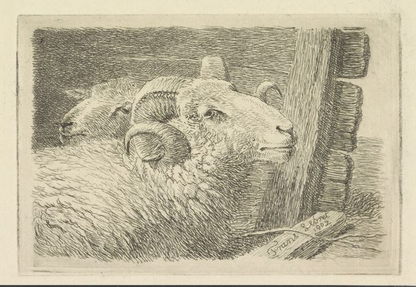 Curator: Here we have Frans Lebret's "Schaap en twee lammeren in een schuur," created around 1895. The piece is rendered primarily in pencil, with the artwork reproduced as a print. Editor: It feels incredibly peaceful, almost pastoral. The texture achieved with pencil really emphasizes the wooliness of the sheep. It has a certain quaintness. Curator: Lebret’s Realist style aimed to depict everyday life, rural scenes often, as authentically as possible. Consider the context – the late 19th century saw rapid industrialization. Works like this offer a nostalgic view of agrarian simplicity, a perspective often consumed by the emerging urban middle class. Editor: Right, and you see how he's rendered the textures of the hay and the wood alongside the animals? It directs my attention toward the labor behind rural life, perhaps reminding viewers of what’s required to make those things. Were images like this presented in a certain way, say within salons or particular journals? Curator: Precisely! These genre paintings frequently appeared in illustrated magazines and at public exhibitions, circulating images of rural virtue, offering moral and social lessons. Notice, also, the chicken perched in the background adds to the realism and reinforces the idea of integrated farm life, or rather, the artistic vision of that life. Editor: I am fascinated by the lines of labor visible within the strokes themselves. You can see where pressure was applied, lifted, reapplied. This drawing carries an intrinsic relationship to work through both the image, and its creation. Curator: Absolutely. Also note the subtle differences in the treatment of the lambs’ wool versus the ewe’s. There's a careful attention to the material quality of the sheep, hinting at the varying textures achieved at different stages of production. Editor: Looking closely, I appreciate the small details like the chicken and the varied strokes. These quiet observations definitely amplify the feeling of serene domesticity but equally demonstrate material production. Curator: Agreed. The placement of such works mattered as much as the strokes made in pencil. Images like this carry significant weight, far beyond just simple images of farm animals, really illustrating an idealized connection between the viewer and means of labor. Editor: Thank you. Looking closely at that labor and social function definitely deepens our reading of its simple forms.