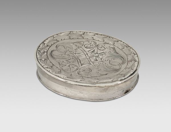 Editor: So here we have a "Box," a silver metalwork sculpture from the 1770s. Its small, almost unassuming, yet the silver catches the light in a very appealing way. The detailing on the lid is gorgeous! What do you make of it? Curator: It’s interesting, isn't it? It reminds me of the stories objects could tell if they could speak! This little silver "Box", dating from 1771-1772, seems simple, but reflects a culture steeped in heraldry and the Rococo style. Do you notice how the clean lines of the cylindrical form are topped with this elaborate engraved crest? Editor: Yes, definitely! It's like a tiny treasure chest of secrets... or snuff, maybe? What exactly is Rococo about it? Is it just the lid's design? Curator: Precisely! Rococo, at its heart, is playful and ornate – think asymmetry and a sense of elegant excess. Though this box appears understated at first glance, the delicately engraved crest encircled by foliage reflects the Rococo love for intricate, organic designs. And yes, it absolutely could've been used for storing something precious like snuff. The family crest tells a story of identity, status… perhaps a hint of pride? I wonder what was so important to them that they wanted it kept safe. Editor: That's fascinating, considering it’s such a small object! I didn’t think it could contain so much information about culture and identity. Curator: Exactly! And it makes you wonder, doesn't it? What small objects of *our* time will tell stories centuries from now? Maybe my sparkly phone case will end up in a museum one day, decoded as an ancient form of glamorous armor. Editor: Ha! I’d pay to see that exhibit! Thanks for shining light on this "Box", I would have walked past it thinking there wasn't anything to explore. Curator: My pleasure! Sometimes the smallest vessels hold the grandest stories, you just need to peek beneath the lid.