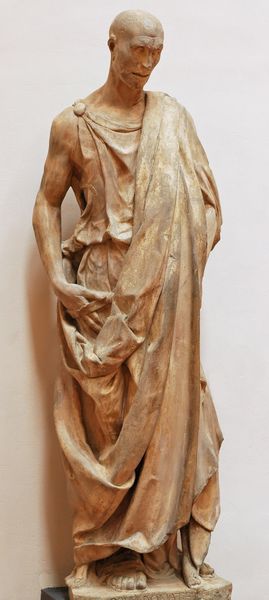 Curator: Jean de Liège's marble sculpture, "Saint Mary Magdalen," dates from around 1350 to 1375. Look closely, and you'll see she carries a small, ornate vessel, probably for holy oil. Editor: There's a gentleness to her form, even though it's hard, cold marble. A wistful sadness seems to emanate from her posture. She is hugging that pot so tightly as though there's something deeply valuable to preserve within it, like lost memories perhaps. Curator: The treatment of marble is fascinating here. Medieval sculpture often functioned didactically, communicating stories to a largely illiterate populace, so it makes perfect sense that Jean de Liège emphasized clarity, legibility and precision of lines in the folds of Magdalen's robe and overall shape. Editor: I imagine the marble dust that would've filled the workshop where this was made. You think about the physical labor to carve that smoothness, a really embodied making of art. But it seems to go beyond skill, reaching some essence of devotion somehow. It almost glows from within! Curator: Indeed. Medieval guilds controlled production quite tightly, dictating materials, processes, and even the types of subjects an artist could undertake, and a good Medieval sculptor would have an intimate knowledge of his material-- where it came from, what were its qualities. Marble signified luxury. Consider what message the commissioners intended in selecting that material. Editor: Luxury but also longevity; marble also stands the test of time, suggesting the saint’s enduring faith through eras of massive social upheaval. Makes you wonder who made that vessel she carries so tenderly, too! Perhaps another craftsman or craftswoman whose name has been lost, but whose contribution remains integral to the overall artistic intent here. Curator: That's the beauty of engaging with the material history; it's a collaborative web, connecting the artist's vision to the societal and economic structures that enable its creation and, hopefully, the artisan or mine worker gets their due credit! Editor: Seeing how thoughtfully everything links in and connects… it's enough to give one goosebumps, honestly! Thank you for all the perspectives and for putting words to some feelings it inspired for me.