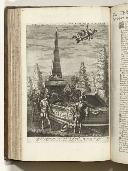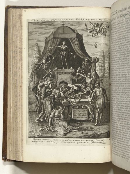 Curator: "Het geopende graf van koning Croesus," around 1707-1708, an engraving by Carel Allard, currently held at the Rijksmuseum. What strikes you about this piece? Editor: It has such a dramatic, almost theatrical feel, despite being a relatively small black and white print. There are so many figures crammed into the scene, all centered around a tomb. What are we really seeing here? How should we read these images? Curator: Precisely! This engraving functions almost like a visual sermon. Allard draws on the tale of Croesus, the famously wealthy king, as a cautionary emblem. Do you see how death, in skeletal form, dominates the scene? Editor: Yes, it’s quite hard to miss, actually! Death standing triumphantly over the opened grave...and there's a putto above with a torch extinguished? Curator: Excellent observation. The extinguished torch symbolizes life's end. Allard uses these potent symbols – the skeleton, the extinguished flame – to remind us that earthly power and riches are fleeting. This image serves as "memento mori," a reminder of mortality. Where does Croesus's famed wealth leave him now? Editor: So the visual symbols function to constantly enforce the central theme – everyone dies in the end. But it goes further than just death, also the vanity of material possessions, of power? Curator: Precisely. It’s Allard commenting through a Baroque sensibility, urging humility and reflection. What’s especially revealing is the line etched beneath the image – "Post Mortem... nos triste exemplo, CRUSE superbe, doces Allar." Can you make something of that? Editor: Well, from what I can decipher, "after death," and then "Cruse" appears in there... It reads like, from his example, even Croesus learns? That's... humbling. Curator: Indeed. Allard is utilizing potent visual language to communicate enduring truths about the human condition. Every object reinforces it. And, do you agree the artwork speaks powerfully, using cultural symbols? Editor: Absolutely, seeing how Allard layers these symbols adds depth. It really emphasizes how artwork from the past carries the collective wisdom of its time, like a coded cultural memory.