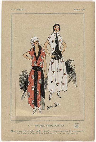 Editor: This drawing by G-P. Joumard, "Très Parisien, 1925," showcases two figures in dazzling outfits, created in 1925. The figures are mostly defined through elegant lines, with soft blocks of color defining their garments. I am especially interested in how their fashionable forms are streamlined through abstraction. What do you make of it? Curator: I am struck by the linear quality, immediately. Note the application of line defining shape and texture, and its strategic importance in delineating form through geometric principles, which provides a compositional foundation for the figures' visual structure. Joumard emphasizes the material of clothing itself as form. Editor: How do the components combine into a single statement, despite some abstraction? Curator: We must acknowledge that it uses line in two ways: both to render representational figures, and also to flatten depth. For instance, consider how the patterning on the figures' clothing flattens perspective. Do you agree with the semiotic suggestion? Editor: Yes, the contrasting geometric forms of the clothing, when seen in their relationship with the whole drawing, certainly highlight and abstract reality, instead of merely representing it. I never considered the line as working in two ways to render figures *and* flatten depth! Thanks for opening my eyes! Curator: Indeed, recognizing those intrinsic elements illuminates its enduring appeal, even across time.