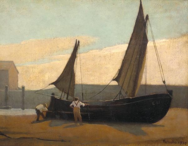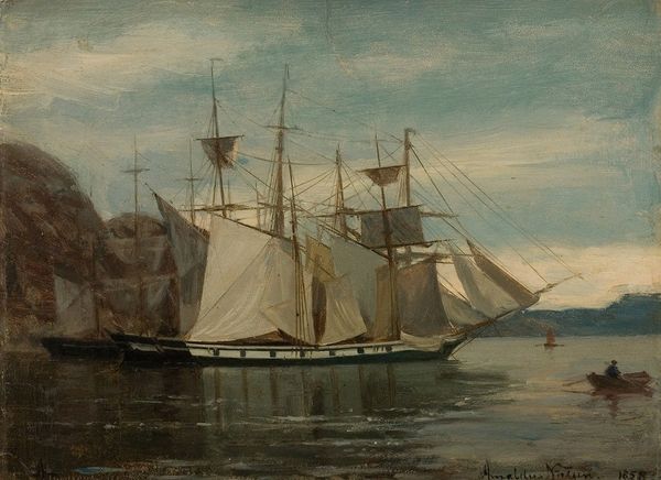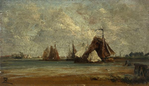 Editor: So, this is Ioannis Altamouras's "Ship on Shore," painted in 1874, using oil on canvas. It strikes me as a surprisingly melancholy take on the typical seaside scene. What do you see in this piece? Curator: I see a commentary on maritime labor and its precarity. Notice the prominent placement of the aging, grounded ship, juxtaposed with the working vessels in the background. Altamouras subtly draws our attention to the socio-economic disparities inherent in maritime culture. Who benefits from these exchanges, and at what costs to those whose livelihoods depend on the sea? Editor: That's an interesting take. I was more focused on the atmospheric qualities, the light. Does the hazy sky add something to your reading? Curator: Absolutely. The soft light obscures crisp details, almost romanticizing the labor. Consider how this contrasts with the realities of working-class existence, often glossed over in favor of picturesque views. To me, the muted palette signifies a suppression, a deliberate softening of harsh truths about labor and survival. The almost imperceptible figures working on the ship underscore this very issue of visibility – who is seen, who is not? Editor: So, you are suggesting it’s not simply a genre scene, but a deliberate, critical commentary? Curator: Precisely. The impressionistic style, with its emphasis on fleeting moments, almost lulls us into complacency. Altamouras uses it as a tool to lure us, and then challenge our perspective by inviting us to think about the lives impacted by the commerce of the sea, the exploitation inherent in the process, and how society tends to make that exploitation invisible. Editor: That gives me a lot to think about! I was viewing it purely aesthetically, but now I see how it engages with broader societal concerns. Curator: That is exactly the potential of any work of art: to challenge what we see and know and make connections across histories and personal lives.