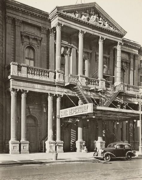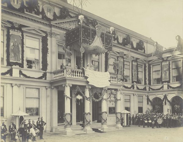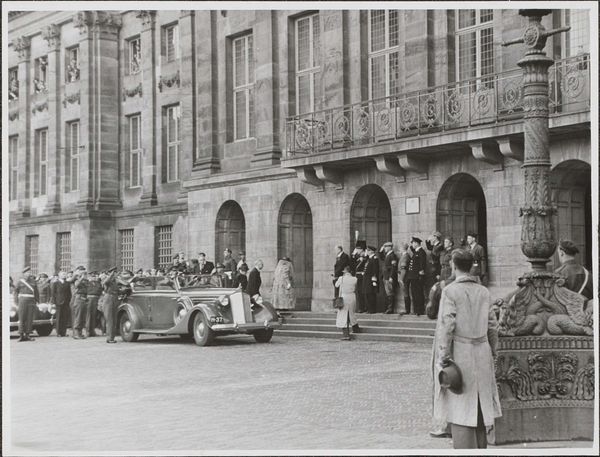 This photograph, taken on June 28, 1945, by an anonymous photographer, captures a parade on Dam Square in Amsterdam during the liberation festivities. It’s a study in contrasts, really. The greyscale palette almost mutes the joyous occasion, giving it a somber undertone, yet the composition bursts with implied motion. I'm drawn to the way the photographer uses light and shadow to carve out depth. Look at the texture of the building, the way the stone seems rough and worn. Then, there's the smoothness of the railing, creating a kind of barrier between the dignitaries and the crowd, and us, the viewers. The sharp lines of the architecture juxtapose the soft, blurred figures on the balcony, adding a layer of visual tension. You know, this image reminds me a bit of some of Gerhard Richter's blurred photographs, where the act of seeing becomes a process of questioning what is real and what is perceived. This photograph is a historical document and a piece of art, capturing the ambiguity of a moment filled with relief and uncertainty.