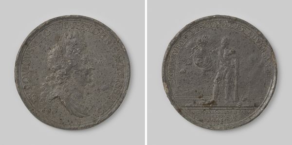 Curator: At first glance, this portrait exudes a sense of understated nobility. It's remarkable how such a limited palette can convey such depth of character. Editor: We're looking at a metal sculpture from 1559, depicting "Margaretha van Calslagen, wife of Joachim Polites," crafted by Jacques Jonghelinck. The material itself, likely lead or pewter, contributes significantly to its somber tone. Let's discuss its place within the cultural moment of Renaissance portraiture. Curator: Absolutely. Notice how the rigid medium emphasizes the social standing of the sitter, Margaretha van Calslagen, through meticulous detail in her attire and headdress. Jonghelinck’s use of metal highlights the period's evolving relationship between art and its aristocratic patronage. The front and back of the metal piece showcase that this was meant to last centuries as it represents wealth. Editor: It's interesting to think about these objects in terms of consumption, though. A work like this begs the question: how did the rising merchant class begin to view artworks like this? Were these pieces, crafted from relatively base metals, signaling new forms of power that relied on financial capital? It stands in stark contrast to royal or religious portraits made from precious stones and precious metals during previous artistic moments. Curator: Precisely. The relative accessibility of materials allowed for wider circulation of portraiture amongst a burgeoning merchant class. And it becomes essential to consider how the artwork acted as a material record for cementing these growing connections. Editor: It speaks to the growing complexity of art's purpose, then, functioning not just as an aesthetic object, but also as a signifier of social mobility within a changing economy. So even an understated sculpture like this encapsulates monumental shifts in how Renaissance society used images to articulate identity and position within a developing social landscape. Curator: Right, analyzing material choices offers vital insight. Editor: A fascinating example of art history speaking through the language of materiality.