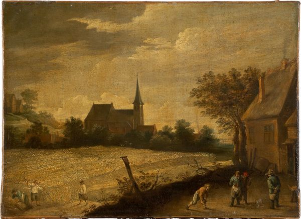 Curator: Before us hangs Jan van Goyen's "Sandy Road with a Farmhouse," created in 1627. It's currently held at the Metropolitan Museum of Art. Editor: It has an air of precarity about it. A feeling of instability seems to emanate from the muted colors and the ramshackle structures. Curator: Van Goyen’s work often touches upon themes of temporality. The broken tree trunk in the left corner is suggestive of death. Consider the implications for our understanding of land, property, and ownership during the Dutch Golden Age. Editor: Absolutely. The figures are dwarfed by the landscape, underlining their own transient existence in the face of broader ecological and socio-economic forces at play. Do we know who they are? What is the nature of their apparent interaction? Curator: They could be merchants, or travelers resting, the artist may suggest Everyman here. The road and humble farmhouse would then signify a place between two points, between prosperity and want, somewhere to take respite before carrying on, regardless of your fate. The dilapidated farmhouse itself—look how carefully the light is reflected. Editor: This painting almost seems to presage later movements toward land reform. Who benefits from this landscape, and what structures maintain or challenge their grip? Look at the precarious thatched roofs. Van Goyen almost feels like a social realist, quietly exposing systemic inequality. Curator: Indeed, his landscapes captured a transforming Dutch Republic—one wrested from water. Van Goyen may have been less invested in directly critiquing inequity and perhaps sought to record its persistence in what was a highly hierarchical world. Editor: That's fair, yet doesn't that act of recording make this canvas a document of observation, one where we too can find ourselves bearing witness to those structures, those continuities of disadvantage and disparity? Curator: It truly makes one contemplate the relationship between art and life, doesn’t it? Van Goyen offers insight not only into a very specific location and time, but also a way to contemplate themes universal to the human condition. Editor: And, of course, that constant process of re-evaluating who is remembered, why, and on whose backs... Curator: Food for thought, absolutely.
