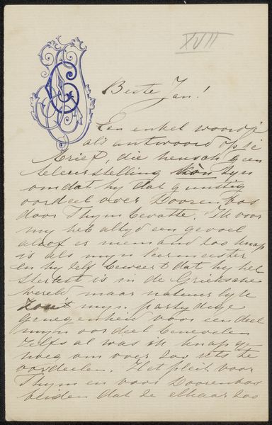 Curator: Here we have “Brief aan Jan Veth,” or "Letter to Jan Veth," created around 1887 by Jacoba Cornelia Jolles-Singels. It's an ink drawing, almost a calligraphic sketch, on toned paper. What's your initial take on this piece? Editor: The texture catches my eye. It's fascinating how the varying pressure of the pen creates a visual hierarchy, from the dark, bold strokes to the almost translucent wisps of ink. It gives the impression of immediate thought being captured. Curator: Indeed. Considering it's a letter, that immediacy speaks to the materials themselves: paper, pen, ink readily available for quick communication. The toned paper, not bright white, suggests a cost-effective choice perhaps indicative of the artist's available resources. Editor: And yet, there's a refined emblem at the top—a personal seal? Its ornate character hints at a certain social standing or aspiration, contrasting perhaps with the hasty script beneath. The number "87" appears near the top corner, does that have any significance beyond simply referring to 1887? Curator: I interpret that number as more of a finding number as the word "Vecht in lnden." or Vecht in London, is also hand-written in pen at the top. Veth was an art critic, author and painter at this time. Think about what that labor represents. This wasn't simply about jotting down thoughts; it was a performance of literacy, of connection-building in a specific artistic milieu, painstakingly crafted by the steady movement of the maker's hand. Editor: I see that. There's a dance here between function and symbol. The letter conveys a message, but its aesthetic elements--the flourish of the script, the personal mark--communicate status, belonging, and shared cultural values. What thoughts do the aesthetics leave us with? Curator: It leaves us reflecting on how much intention, craft and sheer human effort were bundled in even the most mundane communications. No quick texts here. Editor: Precisely, It reminds us how physical objects, even simple notes, accumulate layers of cultural significance over time.