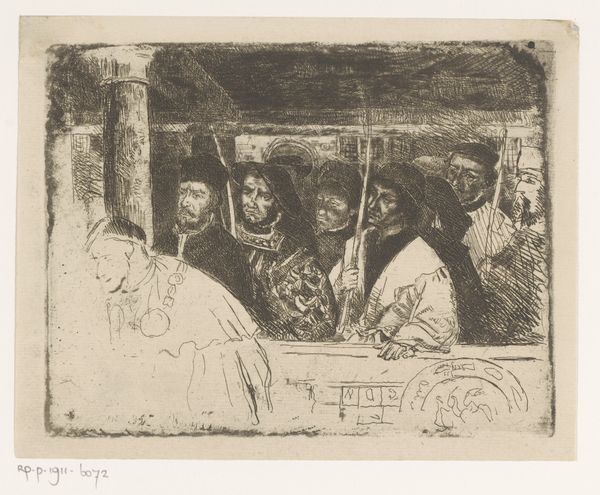 Henri Leys created this etching, "Boogschutters van de Antwerpse schutterij," around the mid-19th century. Notice how Leys uses line and composition to construct a scene filled with figures. The stark contrast between light and shadow carves out each individual from the collective. We see the archers arranged behind what looks like a parapet. The artist uses closely hatched lines in an almost chaotic manner to define the figures and their attire. The linear quality imbues the scene with a sense of depth and dimension, even though the etching is relatively small. Leys skillfully manipulates the etching medium to create an atmosphere that feels both historical and immediate. The lines feel raw and sketch-like which can be interpreted through a semiotic lens. The rough lines, rather than polished details, may signify authenticity and a direct connection to the past. Ultimately, the etching’s power lies in its formal construction – the dynamic interplay of lines and shadows that evoke a vivid sense of the past. The artist’s visual language is one of suggestion and evocation, a demonstration of how form communicates meaning.