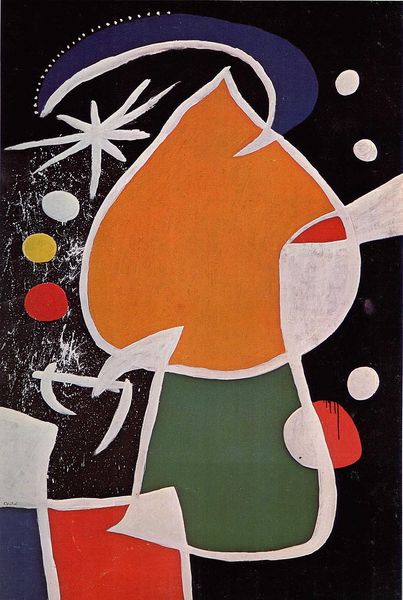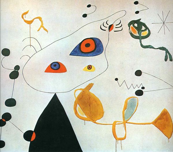 Curator: Here we have Joan Miró's "Rhythmic Characters," a painting completed in 1934 using oil on canvas. It's a fascinating piece, emblematic of the Surrealist movement he helped define. Editor: It feels instantly playful and a little unsettling. The floating, abstract forms suggest figures, but they're so far removed from reality. The palette is surprisingly earthy for a surrealist work, don’t you think? Curator: I do, and I believe that grounding stems from Miró's Catalan roots. He often synthesized international avant-garde movements with his personal connection to the landscape and cultural identity of Catalonia. "Rhythmic Characters," as you observe, features those biomorphic forms which he often employed, a type of organic abstraction he explored alongside artists such as Jean Arp. Editor: There’s something very… intentional about their awkwardness, wouldn’t you agree? I mean the characters feel less like a celebration of the subconscious and more like a deliberate disruption of societal norms around representation, gender, maybe even the rising fascism in Europe. Was that on his radar? Curator: Definitely. Miró situated himself amongst intellectuals who used artistic expression to subtly criticize power structures. I am not certain his imagery is explicitly against a regime. But I'm sure it served as an act of reclaiming imagination in an environment increasingly governed by ideology and propaganda. He advocated art to be rebellious! Editor: I am intrigued by that balance you mention between aesthetic innovation and socio-political messaging. So, rather than seeing the painting as mere decoration or fantastical escape, we consider it almost a form of quiet resistance—the assertion of individual freedom. Curator: Exactly. And understanding the public debates surrounding Surrealism and its role in defining public art also unlocks a richer appreciation for its complexities. Editor: That's a fascinating perspective. Next time I view it, I will recall how Miró advocated free rebellion. Thank you for pointing this out. Curator: Indeed! I feel refreshed whenever these sorts of discussion emerge. Thank you for your insights, too!