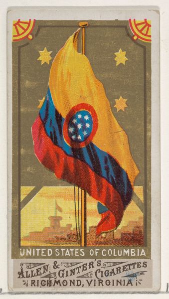 This small card showing the flag of Chile was produced by Allen & Ginter Cigarettes, of Richmond, Virginia. It's a lithograph, a printmaking process which relies on the skillful application of ink to a prepared stone or metal plate. The inherent qualities of lithography – its capacity for relatively quick reproduction – are significant here. Like other cards in the "Flags of All Nations" series, this one was included in cigarette packs as a collectible premium. This was a tactic to encourage repeat purchases, and brand loyalty. Think about the social context: mass production, consumerism, and global trade all rolled into one tiny object. The lithographic process, while capable of great nuance, here delivers a bold, graphic image, in keeping with its role as an advertising tool. The flag’s design is simplified, yet still recognizable. Consider the amount of labor involved in creating thousands upon thousands of these cards. Ultimately, this little lithograph is a testament to the power of materials and making. It collapses the distinction between art and commerce, reminding us that even the most humble objects can carry rich cultural significance.