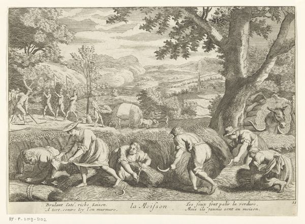 Claudine Bouzonnet Stella etched ‘Kornet høstes’, or ‘The Grain Harvest’, sometime in the 17th century. This print exemplifies a burgeoning interest in rural life and labor that was also reflected in other art forms, like literature. Made in France, this image reflects the period's social hierarchy. While seemingly celebrating the agricultural workforce, prints like these also served to aestheticize and, in a sense, control perceptions of labor, presenting an idealized version that arguably distanced the upper classes from the harsh realities of peasant life. Note the picturesque landscape in the background and the orderly arrangement of the figures. These elements contribute to a sense of harmony and idealized rural life. Understanding such a piece necessitates looking at period documents. Estate records, economic treatises, and even literature from the time provide insight into the complex relationship between the elite and the working class. By examining these sources, we can better understand the social conditions that shaped Stella’s work.
