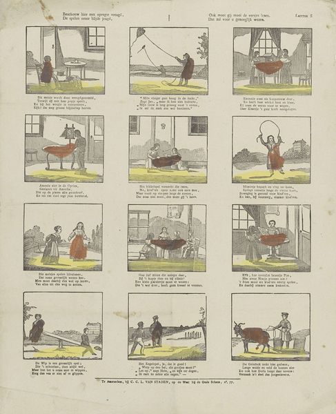This print, made by Lutkie & Cranenburg, presents a series of scenes depicting horse-drawn carriages and carts within individual boxes. The composition is structured as a grid, each rectangle framing a distinct vignette. The colour palette is subdued, with gentle washes of blue, green, and brown delineating the figures and landscapes, creating a sense of quaint simplicity. The organization into discrete units invites a structuralist reading. Each scene can be seen as a sign, conveying a particular message about transportation, labour, or social class. The repetition of the motif – variations on horse and vehicle – emphasizes the underlying structure of daily life and movement. The semiotic system at play uses familiar imagery to reinforce societal norms and hierarchies, even as it presents a seemingly innocent tableau of everyday scenes. Note the overall effect isn't just aesthetic as it conveys underlying cultural meanings about work, transport, and social roles in 19th-century Netherlands. The artwork becomes a site where ideas about progress and tradition, labor and leisure, converge and are open to interpretation.