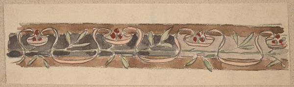 Editor: This is Charles Sprague Pearce’s "Study for a Border Design," created sometime between 1890 and 1897. It's rendered in watercolor and colored pencil, giving it a soft, almost muted quality. Initially, it feels like a fragment of something larger, like a piece of classical frieze. What do you see in this piece, and how do you interpret the symbolism at play? Curator: The recurring motif of leaves and berries evokes themes of abundance, prosperity, and continuity – echoes of ancient Roman and Greek decorations where such images symbolized the bounty of nature and were often linked to specific deities. The serpentine line is interesting; it could symbolize eternity, the cyclical nature of life, or even be read as a subtle reference to the caduceus, a symbol of Hermes or Mercury, often associated with commerce and negotiation. Editor: That’s fascinating! I hadn't considered those specific historical connections. Is there anything unique about Pearce's rendering of these traditional symbols? Curator: Absolutely. The subdued color palette and slightly asymmetrical arrangement provide a modern sensibility. It suggests a departure from the rigid, highly stylized decorations of previous eras, hinting at a more naturalistic, perhaps even psychologically driven, approach. It makes you wonder what kind of space Pearce intended this design for, what sort of mood or message he hoped to instill. Editor: So, the traditional symbols are almost being reinterpreted through a modern lens? Curator: Precisely. By taking these well-worn images and presenting them in a fresh, almost understated way, Pearce is creating a bridge between the past and the present, inviting viewers to reconsider the enduring power of these symbols. Editor: I hadn't really considered how much symbolism was embedded even in something that seems relatively simple on the surface. It’s definitely given me a deeper appreciation for decorative arts and how images accrue meaning over time. Curator: Indeed. And hopefully it serves as a reminder that even seemingly simple designs carry within them layers of cultural memory, waiting to be decoded.