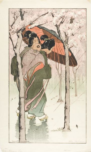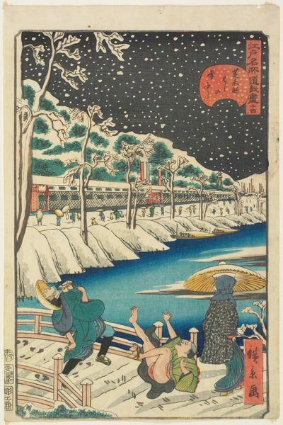Katsushika Hokusai created this woodblock print, Traveler in Snow, during the Edo period in Japan, a time marked by relative peace and prosperity under the Tokugawa shogunate, but also strict social hierarchies and isolationist policies. This print captures a moment of quiet resilience amidst a harsh winter landscape. The figures—one on horseback, the other on foot—are making their way through the snow-laden terrain, their bodies cloaked in heavy garments. This image subtly challenges the traditional representations of the warrior or noble often depicted in Japanese art by showing ordinary people on a difficult journey. There's an emotional weight in their solitary struggle against the elements; an allegory for the journeys we all undertake, regardless of social standing. The stark beauty of the winter scene underscores the shared human experience of perseverance. The image is about how we shape our identities through movement, work, and the negotiation of our environments.