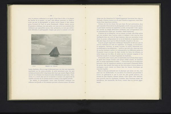 Editor: We're looking at "Zeilschip The Aurora," created before 1898 by G. West & Son. It seems to be presented on two pages of a book, the image appearing twice, side by side. There's something so graceful and airy about it; how would you interpret this work based on what we can observe directly? Curator: From a purely formalist perspective, one might begin with the interplay of light and shadow. Notice how the monochromatic palette and diffuse lighting flatten the image, emphasizing shape over depth. The sail, the focal point, creates a strong diagonal line that directs the eye across the composition. What is the effect of the image being displayed twice? Editor: I hadn’t thought about that, but the mirrored duplication is intriguing. Does it possibly amplify the impact of the yacht's form? Curator: Precisely. Repetition, as a compositional tool, compels a more sustained visual investigation of the sail's geometric properties. It emphasizes a study in form, devoid of symbolic meaning or contextual references. This detached objectivity encourages the viewer to analyze the intrinsic elements. What do you make of the space surrounding the yacht? Editor: It almost looks like a void. It pushes the focus even more to the sailboat, abstracting it in a sense. Curator: Correct. The relative emptiness foregrounds the linearity of the vessel. Our analysis of the structural elements isolates the form and shape in the image from broader narrative or external meaning, which is core to our formalist examination. Editor: That's a fresh approach for me. By concentrating solely on its inherent components, it unlocks new ways to engage with and discuss its impact! Curator: Agreed; such a strategy reveals the essence of its aesthetic construction and artistic language.
