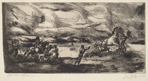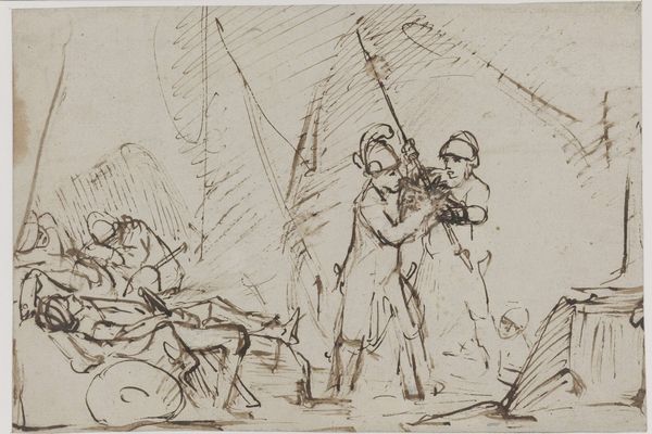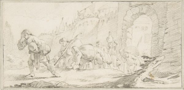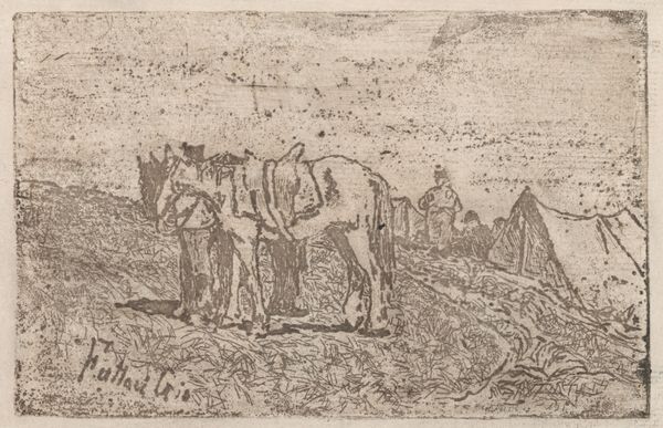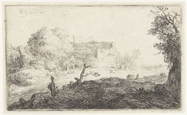 Editor: Okay, next up we have Karel du Jardin's "Italianising Landscape with a Man and Dog, and a Shepherd and Horse," made between 1652 and 1659. It’s an etching, so quite small. It feels almost like a memory, captured in these delicate lines. I’m immediately drawn to the figures; they seem so self-contained in this vast landscape. What jumps out at you? Curator: Ah, yes, the charm of pastoral simplicity, wouldn't you agree? It whispers of journeys and rests in sun-drenched fields. What intrigues me most about du Jardin's work is how he distills the Italian landscape through a Northern lens, a sort of wistful imagining. Notice how the lines dance and weave, creating a tapestry of light and shadow. Does the man at the foreground appear to invite you to come along? Editor: He sort of does! But what’s with the "Italianising" part? Was he actually in Italy? Curator: A fair question! Many Dutch Golden Age artists, including du Jardin, never actually set foot in Italy but were deeply inspired by its art and the romantic idea of the landscape. This print becomes an interpretation of an ideal, infused with a longing for a different way of life. Do you think it's an authentic depiction? Editor: Hmm, probably not entirely. It feels more like a fantasy. Like the artist is using Italy as a blank canvas to express his own feelings. Curator: Exactly! It’s the fantasy that sings, and it blends a yearning with keen observation. See how he uses line to evoke texture and atmosphere. There is such lightness. Editor: It's made me realize how much our idea of a place can be shaped by art, even if we've never been there ourselves. And now I really want to see Italy. Curator: Off you go, then! It has indeed enriched my vision as well! A landscape etched in dreams.