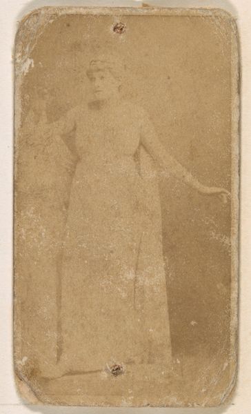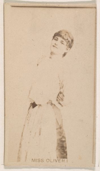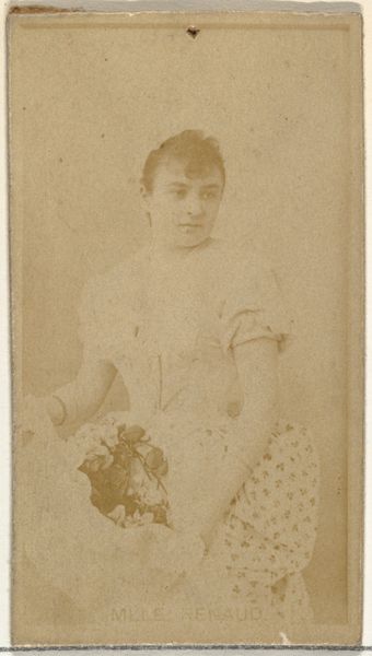 Curator: What immediately strikes me is the delicate tonal range in this print; it’s almost entirely variations on sepia. The composition seems quite simple, centered, with the figure filling most of the space. Editor: Indeed, let’s situate this piece. What we have here is a promotional card dating from around 1890-1895, part of a series titled “Actors and Actresses” produced by W. Duke, Sons & Co. to advertise Duke Cigarettes. These cards, combining photography and printmaking, were immensely popular as collectibles at the time. Curator: You’re right, understanding its origin certainly enriches its context. The focus is clearly on the figure. Notice the way the light subtly catches the ruffles of her costume. This gives a sense of volume, particularly around her skirt, despite the limited contrast. Editor: The actress depicted here is Mlle. Mante. Cards like this weren't just about selling cigarettes; they were actively shaping public perception and contributing to celebrity culture, democratizing access to imagery of prominent personalities. Mante, by having her image reproduced and distributed so widely, cemented her status. Curator: It’s interesting to think of celebrity constructed and circulated through tobacco products. Thinking about the pose—somewhat demure but still presented for public consumption—it reads as an intriguing play with visibility. Editor: Precisely! The card encapsulates a tension between private identity and public image, fueled by both the entertainment industry and consumer culture. Curator: It’s a tiny object holding big cultural significance. My reading now is of a powerful and knowing female figure. Editor: Ultimately, these cards speak volumes about the birth of modern consumerism and its symbiotic relationship with the performing arts. What might appear like a simple portrait reveals profound connections across entertainment, advertising, and societal values.