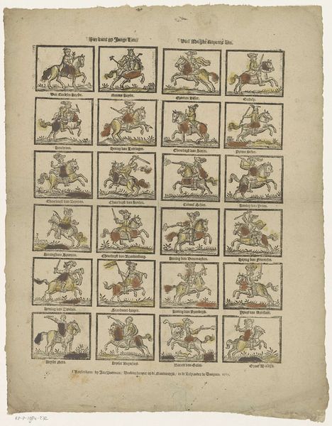 Curator: Here we have "Wilde beesten / wreede dieren (...)" which roughly translates to "Wild Beasts/Cruel Animals". This work, attributed to Erven Hendrik van der Putte, dates between 1767 and 1793. It's a print—specifically a woodcut, I believe, with ink on paper. Look closely, and you’ll also spot some pen work and watercolour. It resides here at the Rijksmuseum. What's your immediate reaction? Editor: Oh, wow. It looks like a page torn from a fantastical bestiary! Each little vignette is so charming and weird. The colors are muted, the paper looks incredibly aged... it feels like a peek into a different world, doesn't it? Curator: Absolutely. This piece reflects the pervasive 18th-century fascination with categorizing and understanding the natural world, but through a lens that blends observation with didactic, even moralistic intentions. The animals are depicted not merely as they are, but as symbolic representations of human traits and behaviors. Editor: I notice the strange composition of these figures and the strange application of colors; it almost makes it feel folk. How does that influence interpretation? Curator: Well, the somewhat naive execution allows us to consider the social context in which this piece was conceived. This wasn't necessarily meant for an elite audience; rather, these illustrations likely circulated among a wider populace, shaping popular perceptions of the animal kingdom. The text accompanying each image – though hard to read here – likely offered moral lessons, reinforcing societal norms through allegorical tales. We might consider, then, how power structures of the time are encoded in the representation of these animals. Editor: The use of woodcut suggests a form intended to make multiples; these pieces may have been more democratic or common, allowing art to be shared more widely across a social and economic spectrum, moving beyond traditional interpretations around the singular "genius". Curator: Exactly! Moreover, folk-art elements offer a lens for understanding its reception within specific cultural and geographical communities. Regional stories, superstitions, and local fauna likely shaped its interpretation, imbuing the work with diverse and personal meaning. Editor: Looking at the whole, I feel it gives one permission to be naive, simple, imperfect—perhaps the animal kingdom gives insight that perfection is not natural at all! It also makes me remember to cherish ephemera. Curator: Indeed, that’s one potential takeaway: how representations shape perceptions and how we can view images within a deeper, critical framework. It’s a reminder that art isn’t just about aesthetics; it’s a powerful tool shaping collective consciousness.