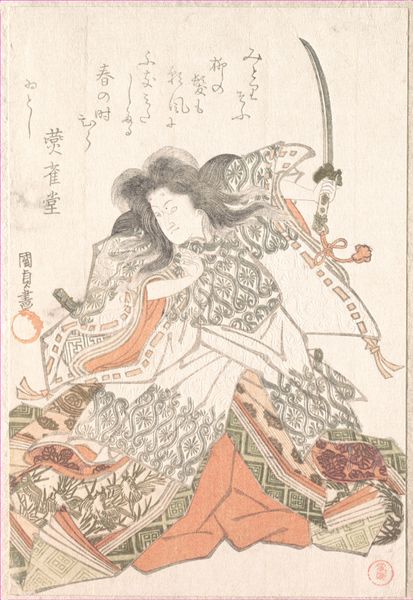Curator: This print by Utagawa Kunisada captures the actor Ichikawa DanjÅ«rÅ VII in the play "Yama mata yama hana no yamagatsu" from 1823. The poem above is by HÅshitei Masunari. Editor: It has an almost frantic energy, doesn't it? The actor's pose, the aggressive patterns, it feels less about representation and more about performance itself. Curator: Precisely. Kabuki prints served a vital function beyond mere records; they were key to shaping the actor's brand and solidifying the play's cultural impact. Editor: Look closely at that sword. The metalwork, the way it reflects light… it speaks to the artisan's skill, highlighting the value placed on craftsmanship within this popular art form. Curator: The print is also an intersection of artistic and social identities. The actor's persona, the playwright's words, the artist's rendering; all contribute to a complex cultural narrative. Editor: It encourages us to see popular theatre not just as entertainment but as a complex network of creative labor, cultural values, and economic forces at play. Curator: And how these prints played a crucial part in the distribution and consumption of those performances. Editor: Definitely, and that’s something to keep in mind when we look at this work.