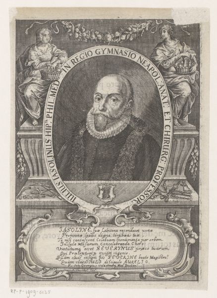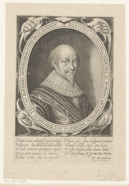 Curator: Look at the weight of the symbolism within this portrait of Diego Sarmiento de Acuña. Simon van de Passe created this engraving in 1622. Editor: Yes, it has such a somber, almost severe mood. The meticulous line work in the ruff and the clothing contrasts strikingly with the relatively plain background, emphasizing a stark duality. Curator: The figure of Acuña himself offers such depth. Acuña was the Count of Gondomar, Spanish Ambassador to England, and a controversial figure due to his perceived influence over King James I. This engraving encapsulates his powerful position and the anxieties it stirred within the British court and public. Editor: Precisely, the ornate frame, the lettering itself feels dense with information and status. Note how the heraldic symbols, and the chain he wears, signify his position and allegiance to the Spanish crown and Catholic Church, at a critical point during rising social conflicts. Curator: Exactly. Consider the politics embedded within such a representational object. He acted as a major figure in diplomacy and espionage between the two powers during an intensely difficult period of Anglo-Spanish relations. The print functioned to make a statement but equally carried the memory and visual language of such fraught associations. Editor: It makes me reflect on the enduring nature of symbols. This particular imagery—the ruff, the coat of arms—conveys themes of status and historical tension that carry down even today. I find myself considering the nature of inherited symbols. Curator: Looking at the engraving in the 21st century is quite relevant, when questions of national identity and geopolitical relationships feel increasingly significant in light of globalization and political upheaval. Editor: Yes, I am grateful to have lingered here a bit longer; these images indeed whisper cultural and historical insight that we should not ignore. Curator: Agreed, its legacy and story are certainly thought-provoking as they challenge our perceptions even centuries later.