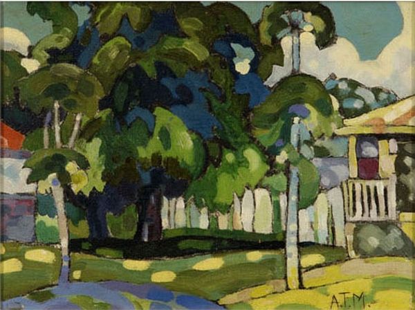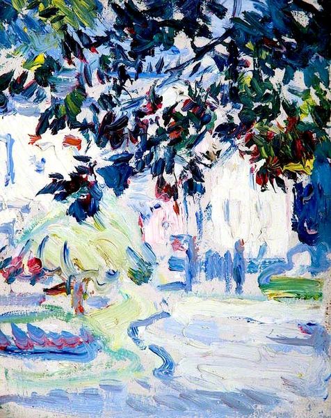 Curator: Look at how boldly Peploe applies paint in his "Street Scene, France," created around 1910. What are your immediate thoughts? Editor: It strikes me as joyfully fractured. The dominant blues against these stark yellows create an interesting interplay of light and shadow, almost to an unsettling degree. It doesn’t quite sit still, does it? Curator: Not at all. As one of the Scottish Colourists, Peploe sought to capture the vibrant light of the continent. During this time, his engagement with French modernism was strong, he repeatedly visited France between 1910 and 1914. There is a conscious engagement with the fauvist movement, which is quite formative in this painting. Editor: Definitely. The composition is undeniably Fauvist, rejecting naturalism in favor of emotional intensity expressed through arbitrary color. Note how the brushstrokes themselves become active participants; staccato marks delineate the trees, buildings, and street. It all builds into a unified surface, but the tension among colors refuses any sense of passive beauty. Curator: Consider how the setting itself informs the painting's reception. This is a period of increasing urbanization, and Peploe's rendering reflects the experience of the modern city. This bold technique moves beyond Impressionism. This fragmented viewpoint captures that evolving understanding of the individual. Editor: Exactly. The composition creates that psychological depth. The solidity of form becomes secondary to color and brushstroke. This emphasis encourages a viewing experience that's about perception and feeling rather than concrete representation. Curator: Absolutely. Viewing “Street Scene, France,” now gives us the chance to look into a pivotal period in art history through the lens of a Scottish artist deeply influenced by French modernism. Editor: It seems Peploe sought to move beyond mere description, delivering a concentrated visual experience. That initial unease settles into an invigorating encounter, I think.