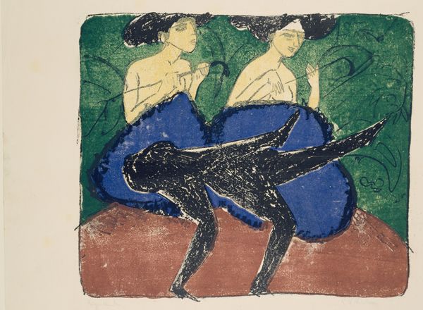 Ernst Ludwig Kirchner created this print, "Bathing Couple", employing woodcut, a medium celebrated for its capacity to produce sharp contrasts. Here, stark, unmodulated color blocks articulate the scene; the intense blue sky, a vibrant green ground, and the figures themselves, rendered in unshaded white, create a visually arresting image. The composition eschews traditional perspective, flattening the picture plane and emphasizing the shapes and forms. The lack of detail in the figures underscores a move away from naturalistic representation. The crude, almost aggressive cuts into the woodblock align with the Expressionist desire to convey raw emotion and a break from academic conventions. The red accent on the seated figure’s head disrupts the visual harmony, adding a layer of psychological intensity. Kirchner’s print challenges our expectations, inviting us to reconsider the relationship between form and content.