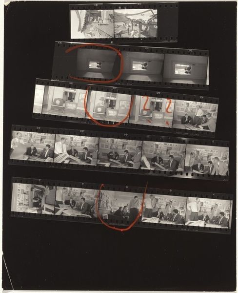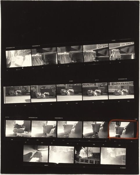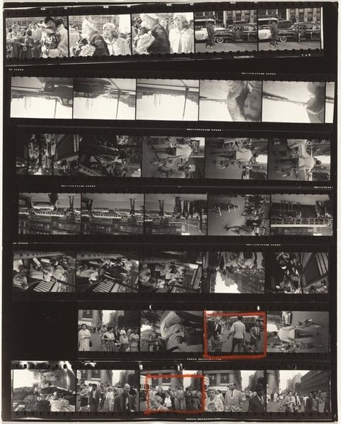 Editor: So, this is Robert Frank’s gelatin-silver print, *Guggenheim 124—New York City* from 1955. It’s a whole strip of film, raw and unfiltered. The city seems…distant somehow, viewed through multiple layers. What do you see in this work? Curator: I see a potent commentary on accessibility and cultural institutions, filtered through Frank's lens. The layers you mentioned act as both a literal and figurative barrier. Consider who traditionally has access to spaces like the Guggenheim, and who is excluded. Editor: Right, it feels like the images are behind glass, a little inaccessible even within the photograph itself. How does that relate to Frank's broader work? Curator: Frank often depicted marginalized communities and critiqued societal norms in post-war America. This image invites us to question the perceived neutrality of museums. Are they truly democratic spaces for everyone, or do they reinforce existing power structures? Consider the gaze: whose perspective are we adopting as viewers? Editor: So, you're saying that the very act of photographing the Guggenheim in this way—through layers, almost like an outsider looking in—is a statement itself? Curator: Precisely. It is about who gets to define and participate in the cultural narrative. What happens when we shift the focus from the art inside to the structure and its role in society? Editor: I never thought about it that way, but it totally reframes how I see street photography. It’s not just documenting, but actively questioning the environment around it. Thanks! Curator: Indeed. By critically engaging with the social context of the artwork, we gain deeper insights into both the art and ourselves. It's a continuous cycle of inquiry and reflection.
