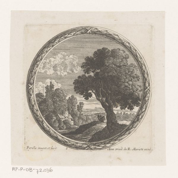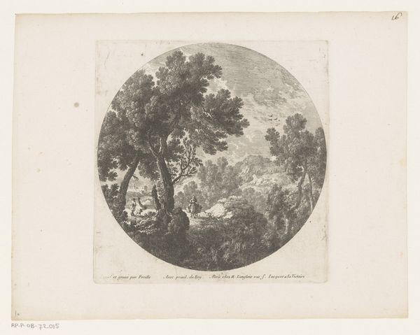 Curator: Before us is "Landschap met bomen en figuren" – "Landscape with Trees and Figures" – an engraving attributed to Nicolas Perelle, likely created between 1613 and 1657. What are your immediate impressions? Editor: A study in contrast, would be my first thought. There’s a kind of starkness in the marks which define all elements: figures, landscape, architecture. It feels deliberately graphic and reproducible, stripped down. Curator: Notice how the etching technique defines the structure: The interplay of light and shadow, achieved through meticulously placed lines, gives volume to the trees. It also creates aerial perspective in the distance. I observe a sort of spatial unity. Editor: Precisely! It’s built for distribution. How the medium lends itself to creating standardized views of idealized nature. Note the labor involved in those countless, precise lines. Also consider the paper it’s printed on – the materials, the economy of printmaking. Curator: The oval format is interesting, isn’t it? How do you feel it impacts the overall composition of this geometric shape? It constrains the view into an organized landscape. Editor: A fascinating detail—the very shape, mimicking a looking glass. This creates a window onto a world carefully crafted, packaged, and offered for consumption. What we’re actually witnessing is the emergence of landscape as commodity. It's the pre-photography postcard! Curator: In its structured view of nature, the line emphasizes shape and form while drawing the eye through its well-articulated space. Editor: This image, a record of both technical mastery and a developing commercial market, allows us to meditate on art’s entanglement with both natural materials and a much wider world. Curator: Well, considering Perelle's structural landscape and use of graphic space, I will reflect again on how technique defines volume, mass and the entire picture itself.