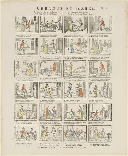 Philippus Jacobus Brepols made this print, titled Klaas Kapoen / Colas Capon, using etching and hand-coloring, sometime before 1845. It’s an early example of mass media: a printed cartoon, intended for broad distribution. Given the relatively simple methods used, we can assume a significant division of labor in its production. Brepols likely designed the image and etched the printing plate, but other workers would have been responsible for the repetitive tasks of printing and coloring. The hand-coloring, though charming, is rudimentary. This suggests that it was done quickly, perhaps by less skilled workers. The cartoon's narrative—a series of misadventures—would have resonated with a wide audience. The very nature of printmaking, and the division of labour it entails, speaks to a growing market for popular imagery. Inexpensive prints like this brought visual storytelling to the masses, reflecting the rise of consumer culture and the changing landscape of labor in the industrial era. It shows how a detailed and intricate image can be produced by a team of workers with diverse skills, contributing to the history of creative practices beyond fine art.