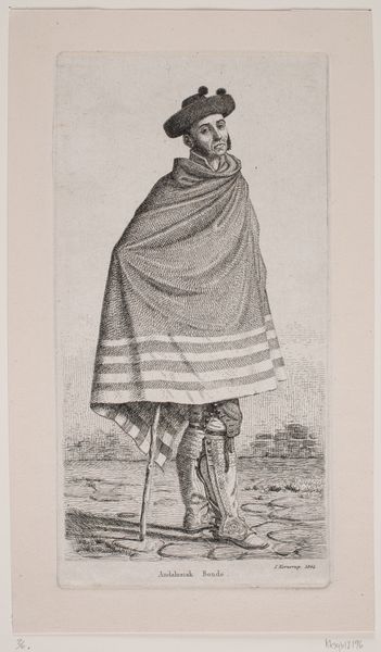 Editor: This is "Ruiter, a Gonaqua captain," a watercolor by Robert Jacob Gordon, dating to around 1778. There's something striking about his posture and the vast landscape behind him. What strikes you most when you look at this piece? Curator: Ah, Robert Jacob Gordon! This isn’t just a portrait, is it? It’s a little theatre of colonial encounter, isn't it? That vast landscape – that's the stage upon which identity, power, and perception play out. I find myself pondering: is this Ruiter's land, or is it Gordon's perception of it? Editor: That's interesting, because it does feel like the Captain is positioned almost like a specimen. Does the setting tell us something about how Gordon wanted to portray him? Curator: Absolutely. Gordon wasn't just painting a man; he was curating an image of the “other.” Notice the detail in Ruiter's clothing, contrasted with the almost sketched-in landscape. It’s as if Ruiter is being cataloged, categorized. What do *you* make of the light? How it hits him versus the background? Editor: It makes him almost pop from the background. Like he's superimposed rather than integrated. I hadn't really thought about it that way before. Curator: Precisely. The sharp focus separates him, turns him into an exhibit. Colonial art, particularly, becomes a powerful tool not only to represent but also to shape perceptions. Editor: So, more than just a portrait, it's a statement about a whole era and its values. Curator: Indeed! It whispers of power, observation, and the complicated dance of cultures meeting on uncertain ground. It reminds me of a passage: "The eye sees only what the mind is prepared to comprehend." How true, no?