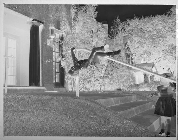 Editor: This is an untitled photograph of a little girl on a front lawn, by Lucian and Mary Brown. It's a small, intimate piece. What strikes me is the girl's posture, almost hunched over, as if she's intensely focused on something. What do you see in this image? Curator: It whispers of forgotten moments, doesn't it? I'm drawn to that strange inversion of light and shadow. It's like a memory, half-faded, half-burning bright. What's she looking at, do you think? Perhaps something utterly magical, only visible to her? It could be anything. Editor: Maybe a bug or a flower? It definitely has a childlike wonder feel about it. Curator: Exactly. It's a reminder that sometimes the most extraordinary things are found in the everyday, if we just take the time to look closely. This photo is more than just a snapshot.